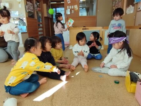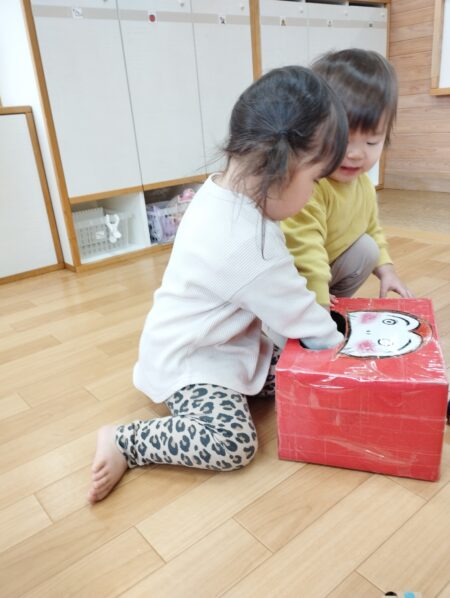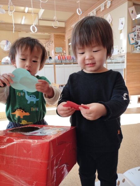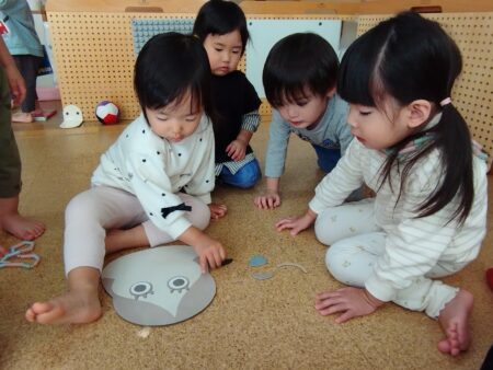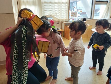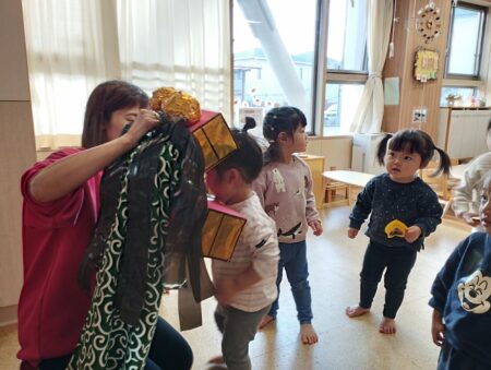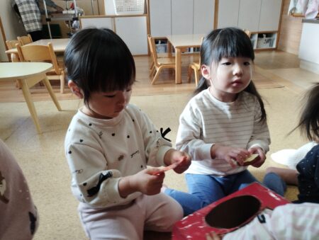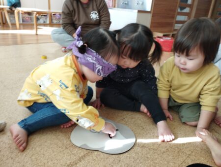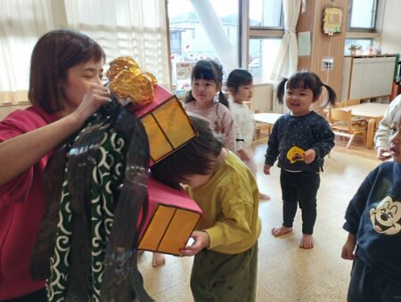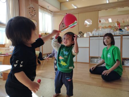 目隠しを怖がらずにする子どもや「見てるよ~」と笑いながら並べる子どももいて盛り上がり初笑いとなりました。