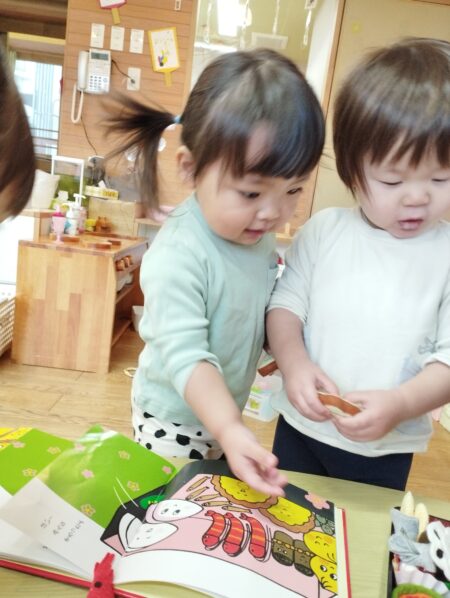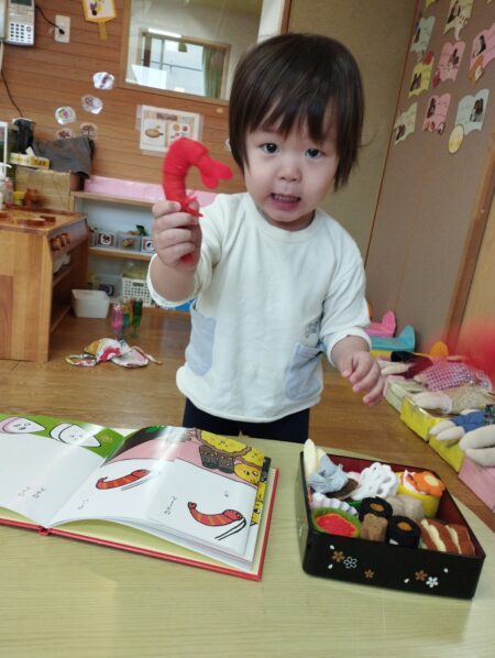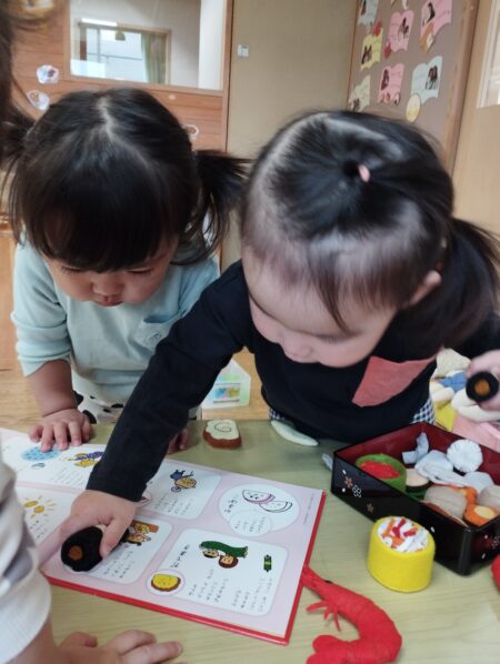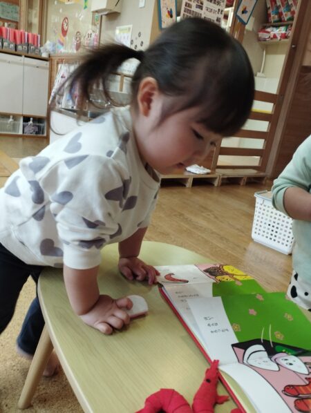おせち料理と絵本を見比べ一緒だねと伝えています。