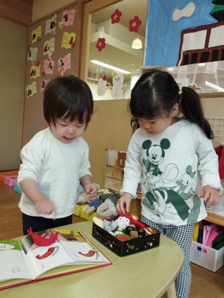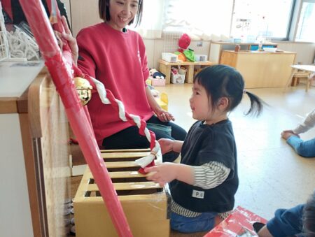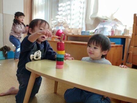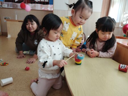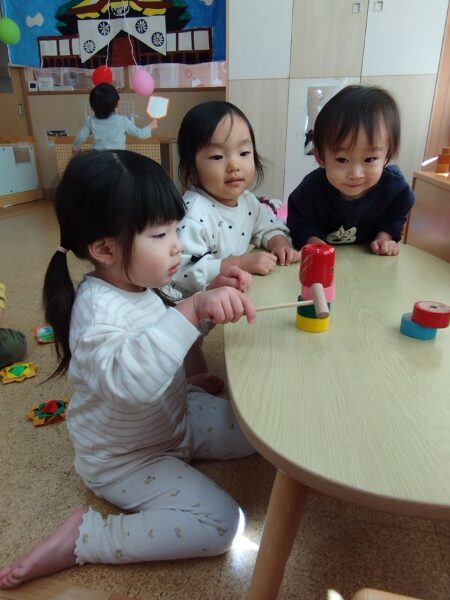 だるま落としでは「じゅんばん!」「カーわって」と声が聞こえ保育者の仲立ちなく楽しんでいました。
