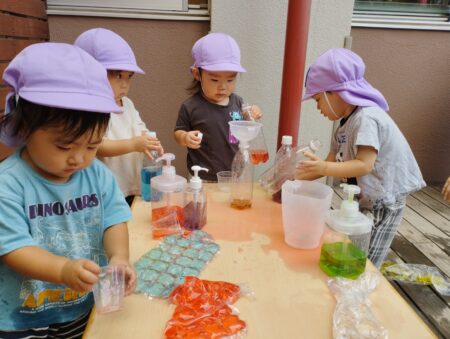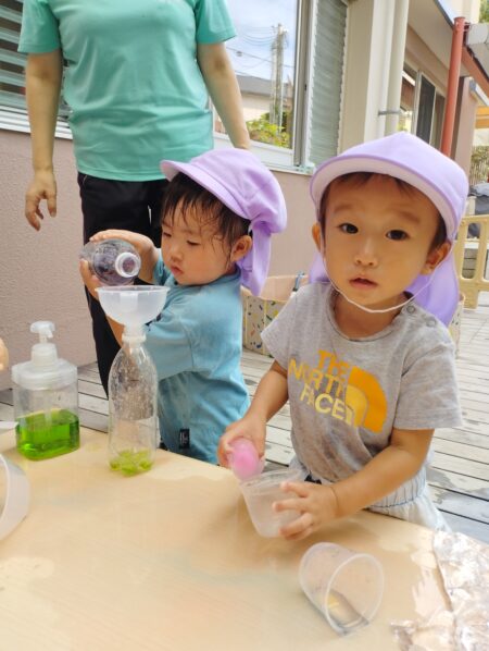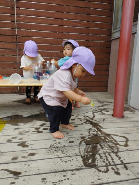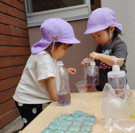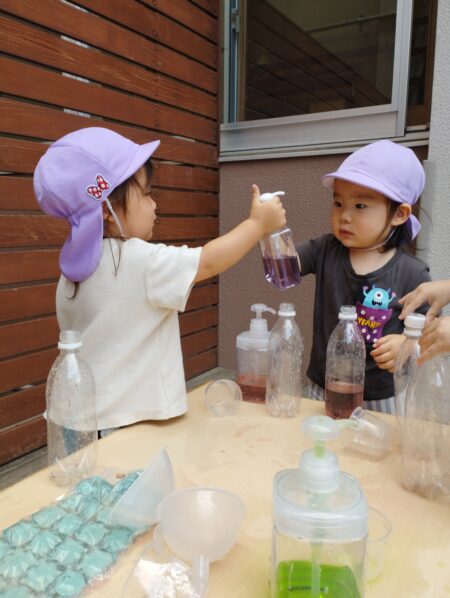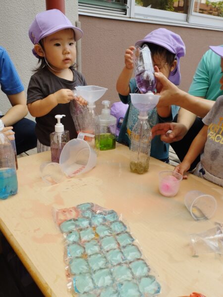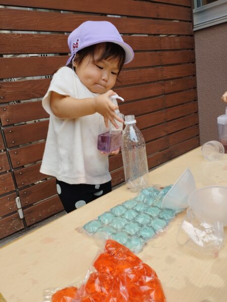 みんな大好きな色水コーナーでは今日も様々なドラマがありました。