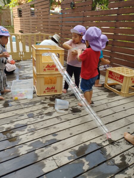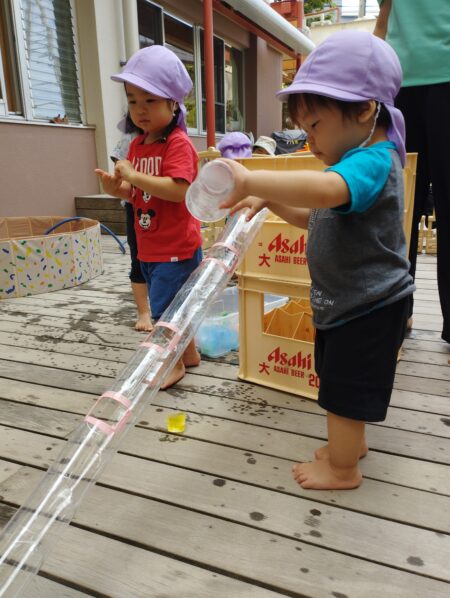 滑らせた氷は勢いよく滑り落ちます。一つずつ滑らせていた子どもたちでしたがカップに沢山入れてまとめて滑らすといい音がして楽しい!と気づいた様子も。