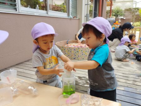 ポンプをギュッと押す子どもとカップを近付ける子ども。協力して遊んでいます。