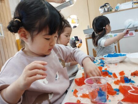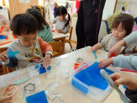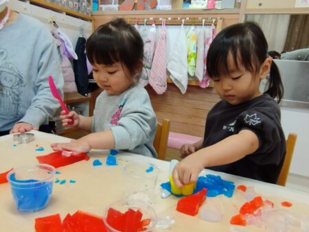 寒天ゼリーに触れる事が久し振りで戸惑う子どもや以前よりダイナミックな子どもと様々でしたが