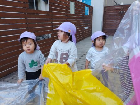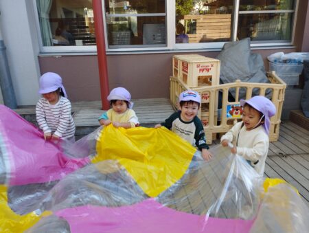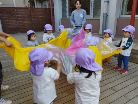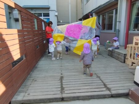 どの子どもも真剣な眼差しで見ていたのでカラーポリで作ったパラバルーンで遊びました。