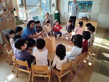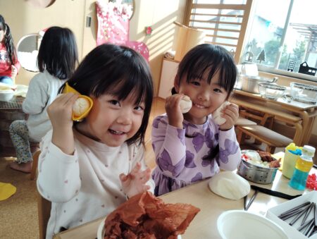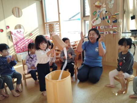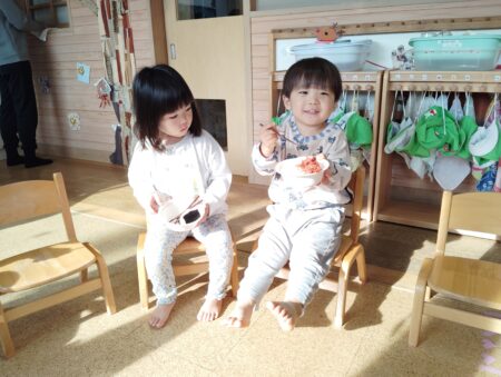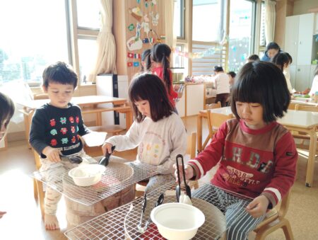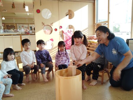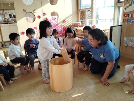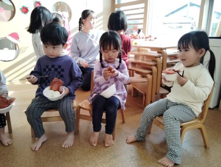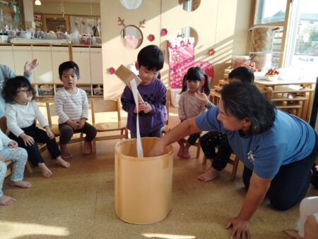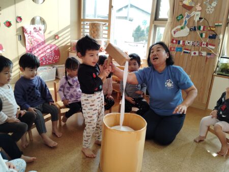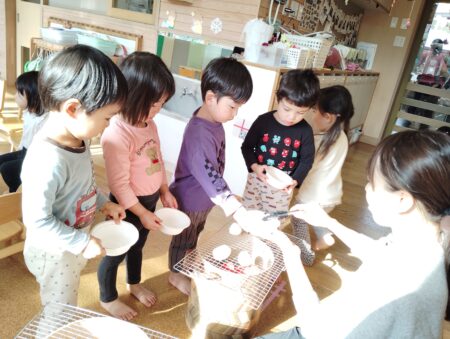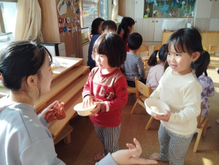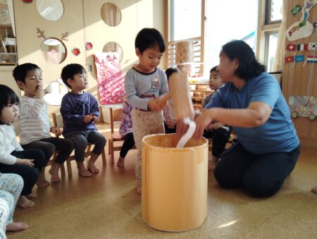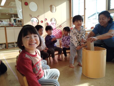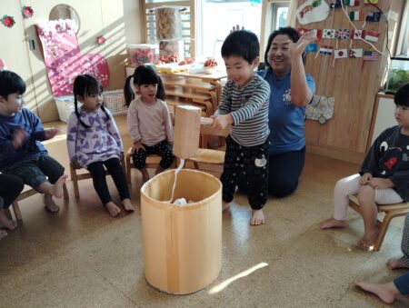 TOP > お知らせ > もちつきあそび かえで組 News お知らせ もちつきあそび かえで組 今度のお餅つきを前に手遊びや歌あそび、絵本を見て、イメージを 膨らますこどもたちは、もちつきあそびをしました。 びよ~んと伸びる餅を歌あそびのリズムに合わせて・・・ ぺったん ぺったん ぺったん、 1234,よいしょ、笑顔で応援しています。 小餅を七輪で焼いたり・・・ どんなお餅にしようかな? おぜんざいになったり… きなこもち、いそべまき・・・ 今度のお餅つきが楽しみねっ! 2025.12.04