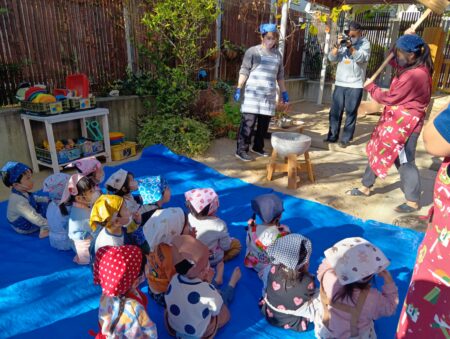 普段のあそびの中からもちつきごっこや絵本の中でもちつきをイメージ出来るように取り組んできました。