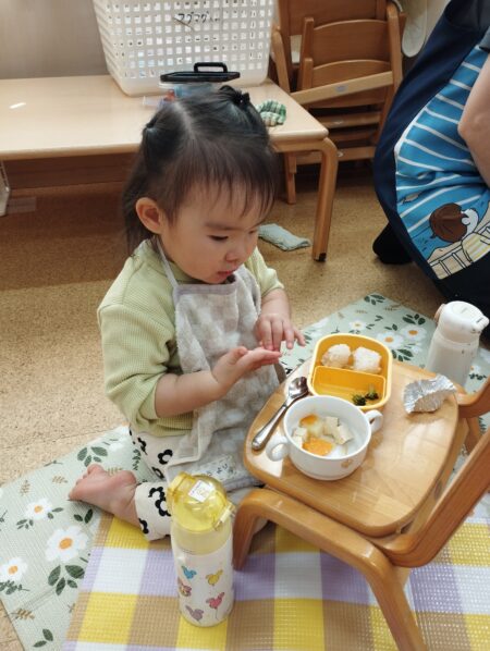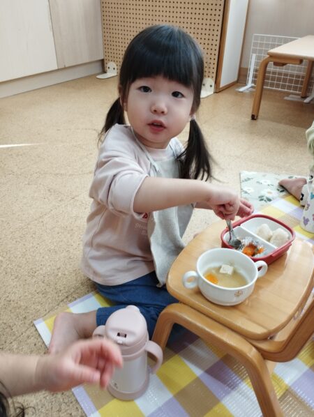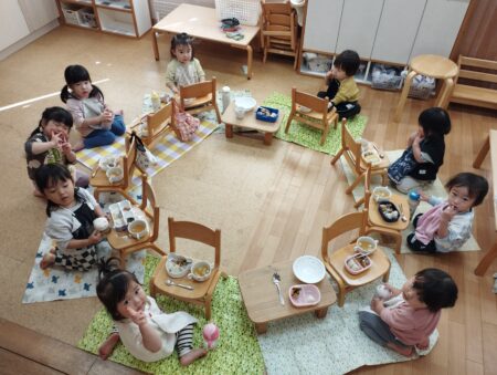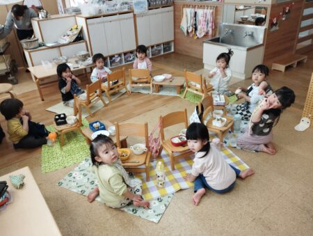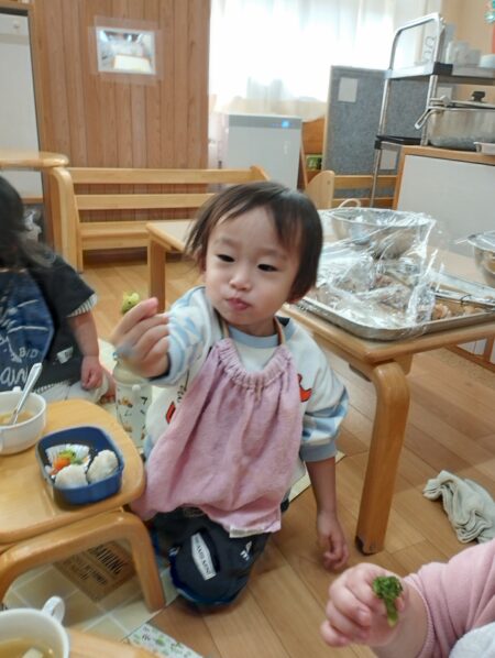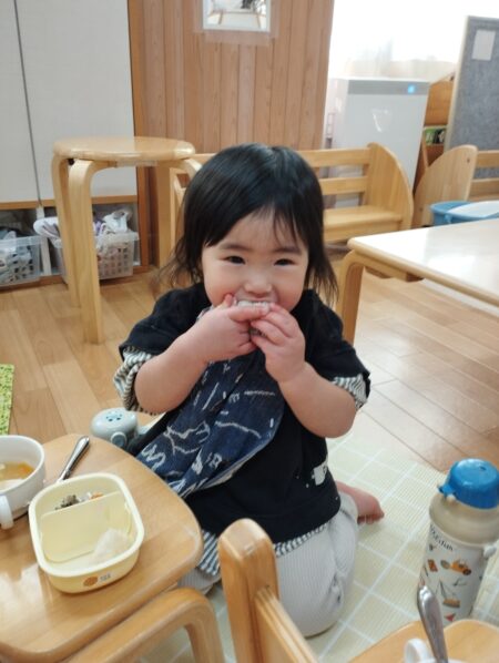 あけぼのひだまりではみんな揃っていただきます、はせず座った子どもから子ども自身のタイミングでいただきますをして食べているのですが