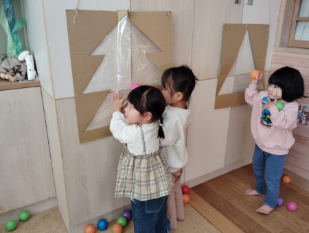 一人一つボールを持ち、どこにくっつくのかを試しています。