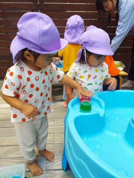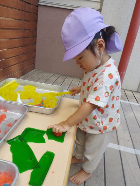 ボウルで作ったゼリーは綺麗な半球型でダイナミックに触れていた子どもも思わずそっと触れています。