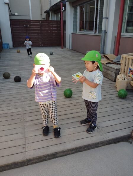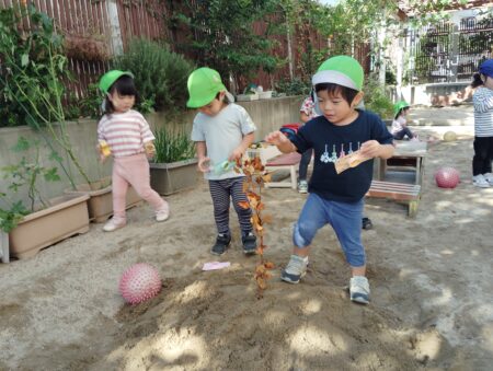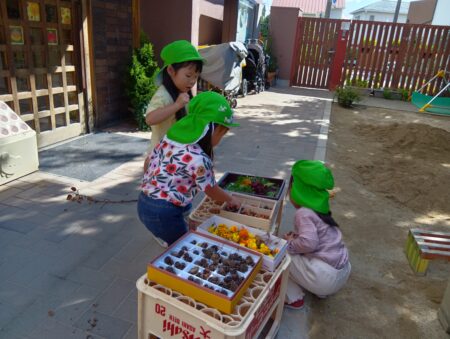 本日は、遠足で拾ったドングリや園庭で集めた植物を使って自然物あそびをしました。