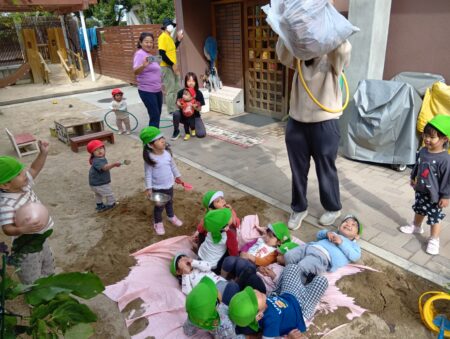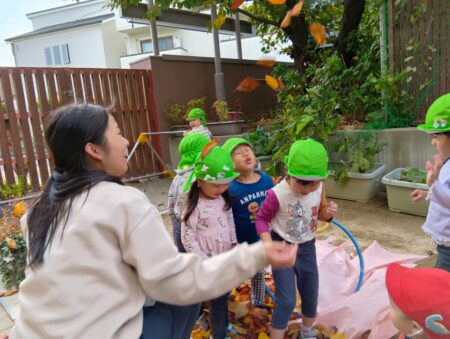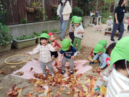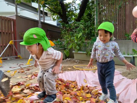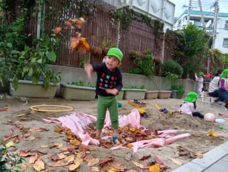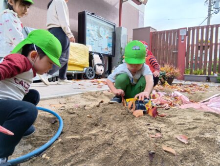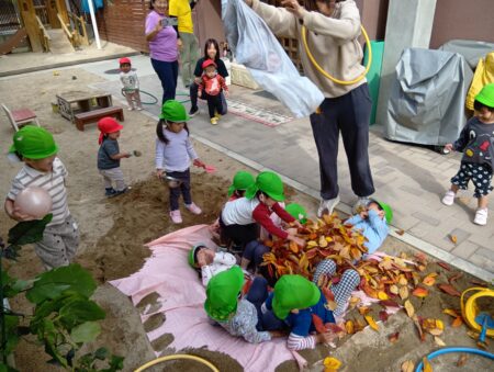 TOP > お知らせ > 落ち葉のお風呂 かえで組 News お知らせ 落ち葉のお風呂 かえで組 本日は、落ち葉あそびをしました。 園庭に砂でお風呂場を作って、そこに期待感いっぱいで寝転ぶ子どもたち。 3.2.1の掛け声で集めていた落ち葉が降ってきます。 「きゃー」と大喜びです。 沢山の落ち葉を上に向かって投げ、舞う様子を楽しんでいます。 落ち葉を土に並べ道路にしたり… 料理をしたり… 川に見立てて飛び越えてみたり… それぞれの楽しみ方を見つけたようです! 2025.11.20