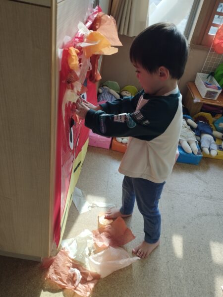 お花紙で遊んだ後は鬼に髪をつけました。