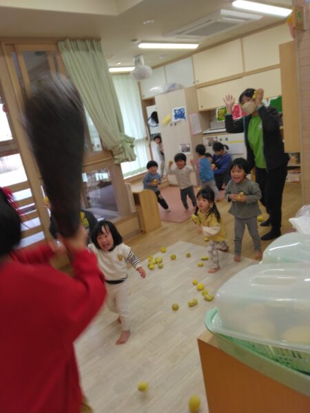 思ったよりも怖くないかも?手作りの新聞紙豆を一生懸命投げたり…