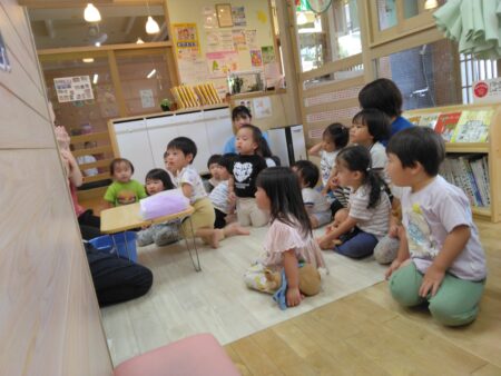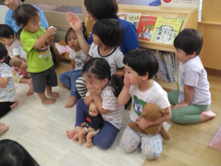 紙芝居に出てきていた“手洗い仮面”のパペットが子どもたちの前に登場すると大盛り上がり!