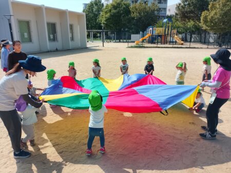 2歳児かえで組は、グラウンドでパラバルーン遊び。