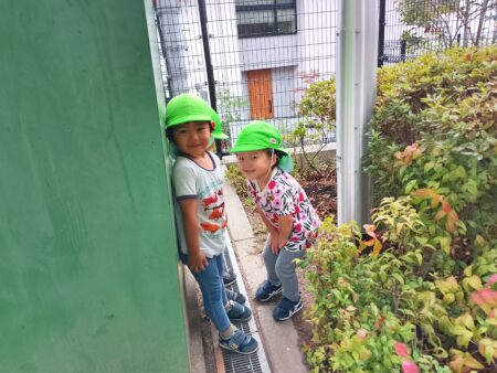 そして、こちらの物陰ではかくれんぼ。「みーつけた!」
