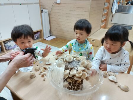 朝に見たきのこが夕方には少し大きくなっており、眼で見てわかり易い食育です。