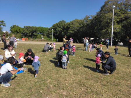 閉会後は、園からのお土産であるシャボン玉を親子で飛ばして遊んで下さっていました。