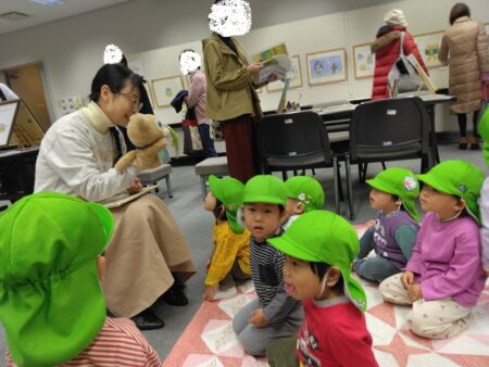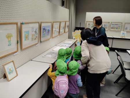 11月中旬に岡町図書館へ出掛けた2歳児クラス。そこでは子どもたちの好きな絵本の原画がたくさん展示されていました。絵本の中に登場するイラストを見つけて、子どもたちは大喜びです。