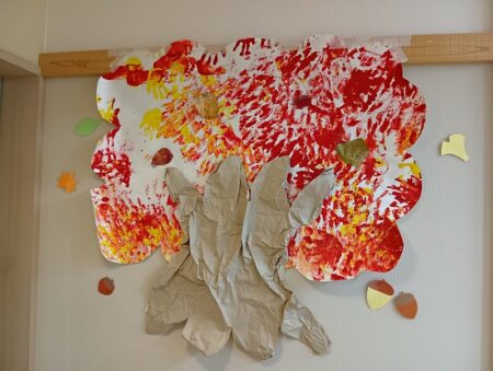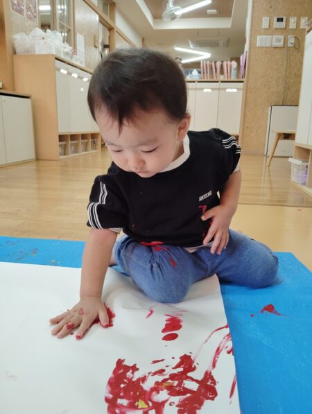 ダイナミックに模造紙の一面に手形や足形をつける子どももいれば、指先で絵の具に触れる等、様々な姿が見られました。