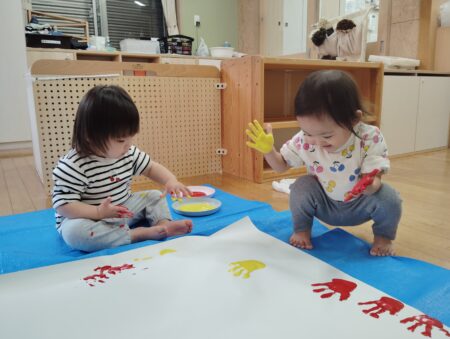 1歳児クラスでは絵の具を使って感触あそびをしました。手に絵の具を塗って、画用紙に手形スタンプをしていくと、次々とかわいい手形が出来ました。