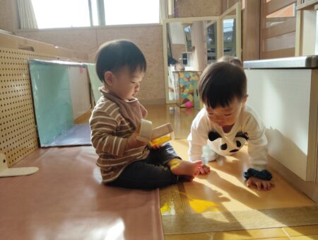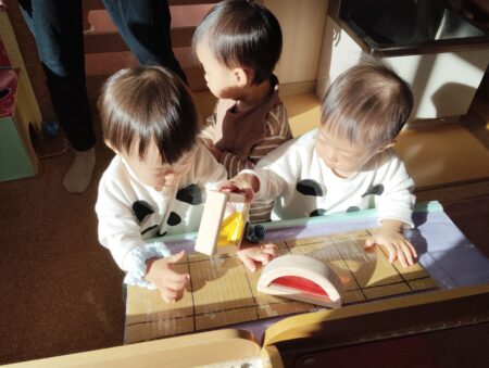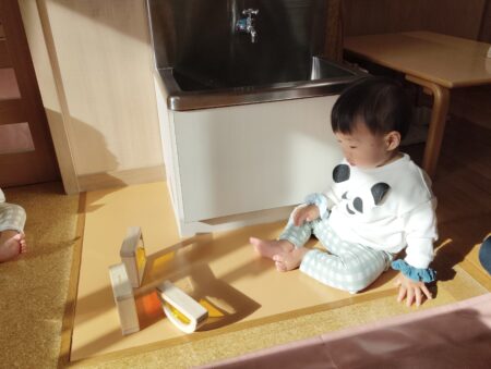 0歳児クラスの保育室の窓から暖かいお日様の光が差し込むと、玩具やパーテーションの穴等、様々な色や形をした影が!その影を見つけると、子どもたちは興味津々です。