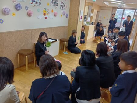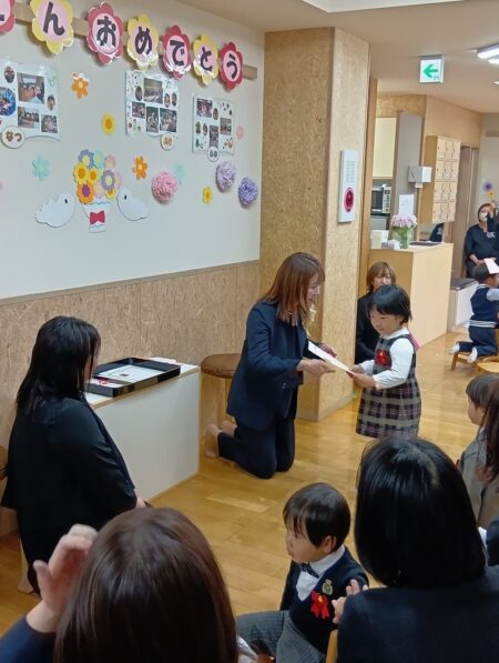 先日、第8回2歳児クラスの卒園式が行われました。保育室や服装など、いつもと違う雰囲気に少し緊張する様子が見られましたが、園長先生から写真入りの手紙を受け取ると、笑顔を見せていましたよ。