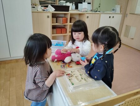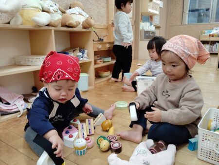 1歳児クラスでは、毎日友だちと玩具を選びながらごっこあそびに夢中になっています。この日は人形と病院セットを用意して、医者ごっこが始まりました。『うさぎさんは、どこがいたいですか?』『ちっくん いたいですよ。』と優しく声を掛けながら、お医者さんになりきっています。
