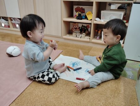 最近、室内あそびでなぐり描きを楽しむ0歳児クラスの子どもたち。好きな色を選びながら、思い思いに描くことを喜んでいます。