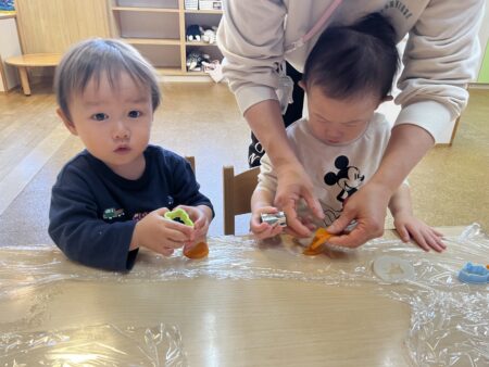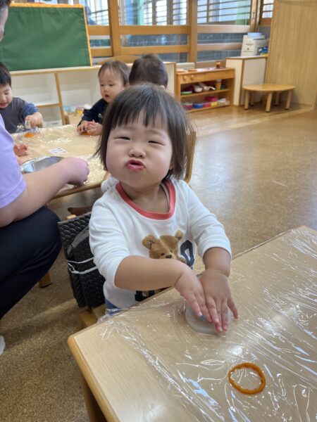 野菜を渡すと、初めは難しく保育者と一緒に手でぎゅっと押して、星や動物の型ができると驚いた表情を見せています。