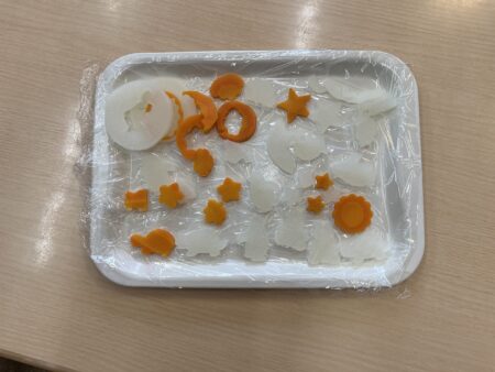 食育で型抜きがしやすいように柔らかくした野菜で型抜きをしました。