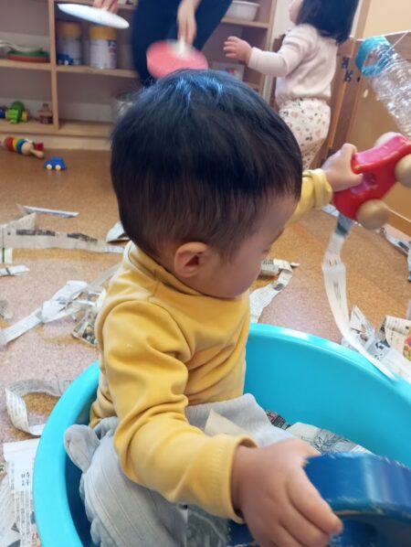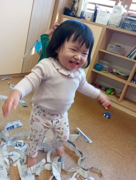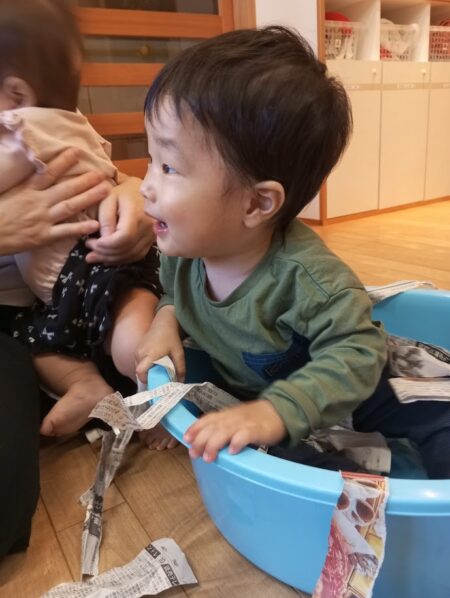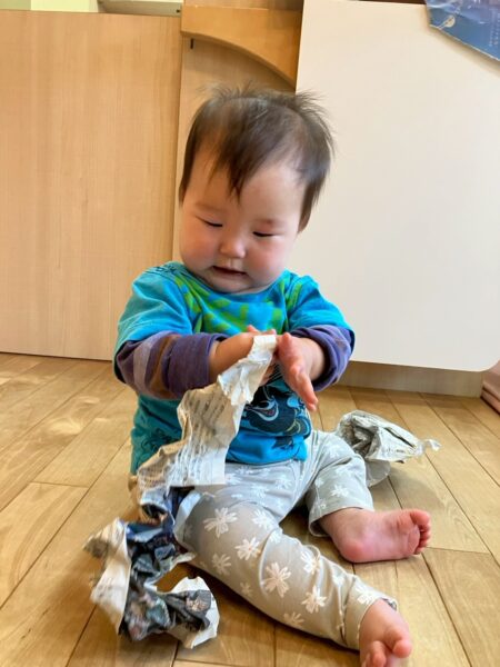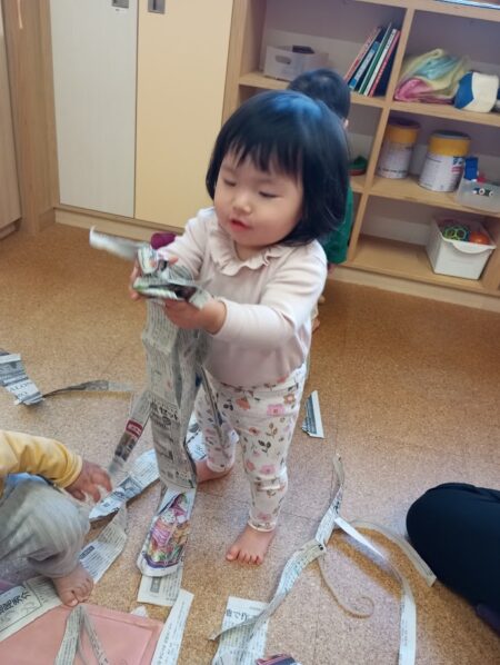 早速、新聞紙をちぎって、音や感触を楽しんでいます。