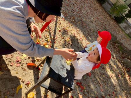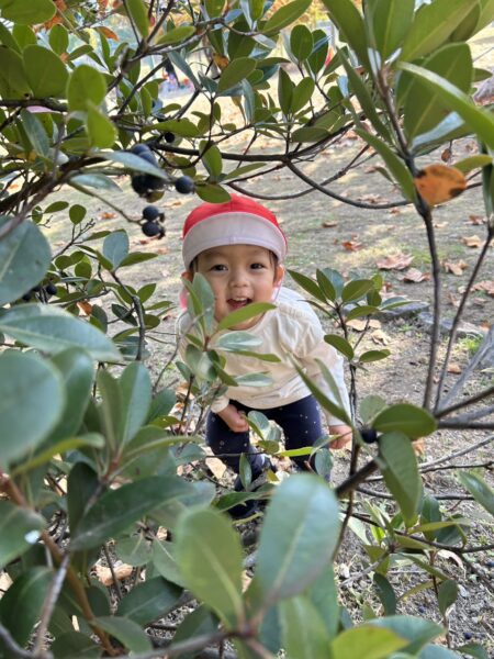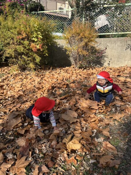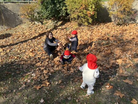 ふかふかの落ち葉の上で遊びながら、まだ残っている木の実にも興味津々な子どもたちです。