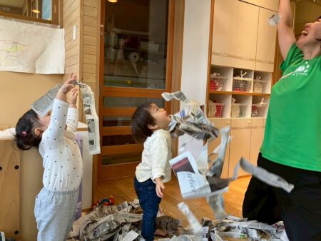 保育者がちぎった新聞紙を空高く上げると子どもたちも真似して遊ぶ姿が見られています。