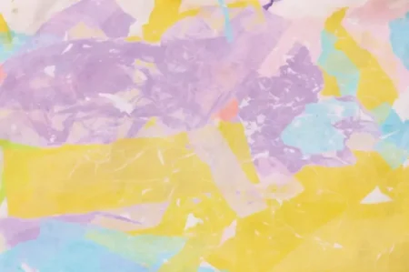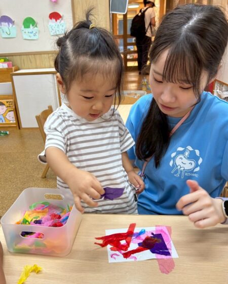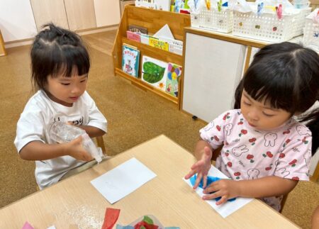 次に白い画用紙を霧吹きでシュッシュと濡らし、その上から色とりどりのお花紙を重ねて置いていきます。水を含んだお花紙は段々としおれてうねうねと踊るように動いたり、ずっしり重たくなったりして変化を感じている子どもたちでした。