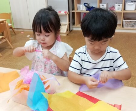 9月15日は敬老の日。おじいちゃん・おばあちゃんに日頃の感謝の気持ちを込めて2歳児クラスはお花紙を使ったプレゼントを作りました。その様子を少し紹介したいと思います。
