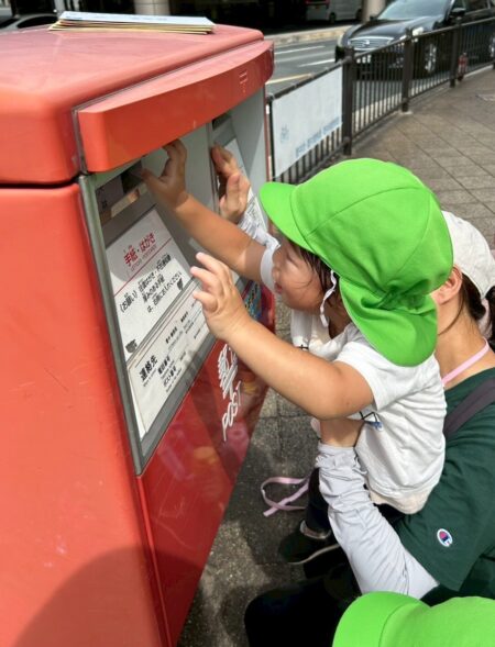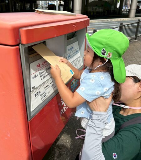 そして、画用紙にのせたお花紙をそのまま数日掛けて乾かし、剝がすと色が転写して素敵な模様が出来上がりました。裏面には写真を載せて手作りのカードを祖父母の方にプレゼントしました。子どもたちの手でポストに投函し、「ポストさん、お願いします!」「届きますように!」と、大事に一通一通入れていました。