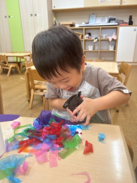 まず、子どもたちはお花紙を思い思いにちぎったりくしゃくしゃと丸めたりして、感触を楽しみながら遊びました。柔らかくて薄い素材に「フワフワ~」「ヒラヒラするね。」とやりとりをする姿が見られました。