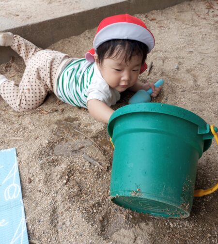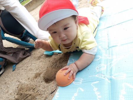 シートの上でくるんと寝返りをすると、” わたしもすなであそぶよ!″と砂を触り始めている様子です。