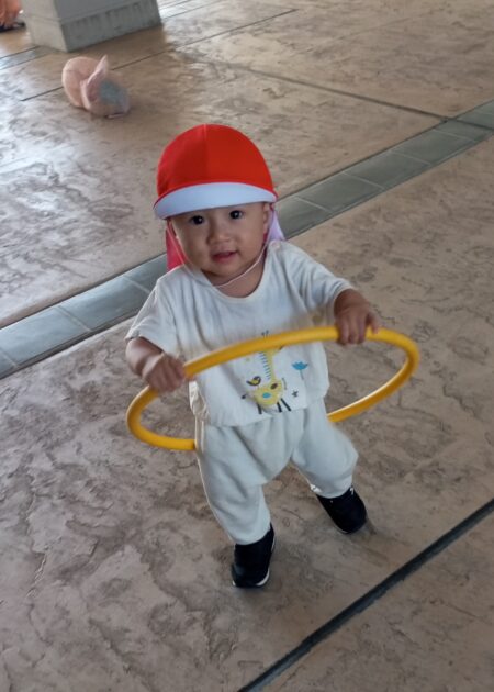 自由に歩く事が出来る様になり、“電車でーす!乗ってくださ~い!”というかのようにフープを使って2階広場で遊んでいます。