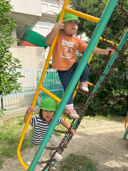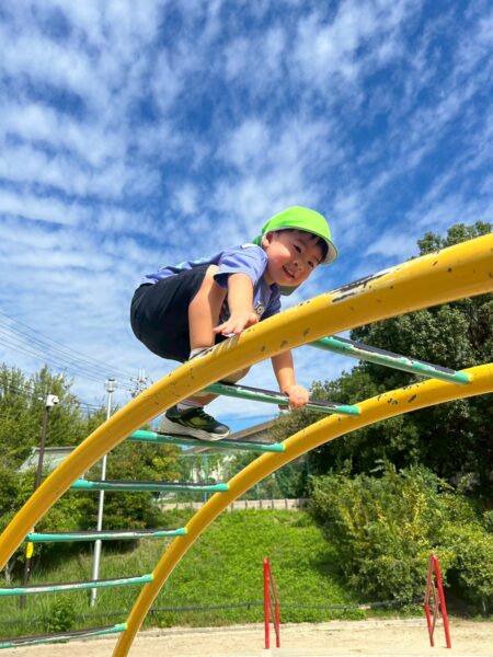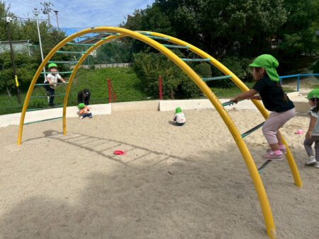 うんていでは、腕や足腰の力がついてきたり、身体の使い方が上手くなり、慎重に前に進んで繰り返し挑戦しています。高さがある為、“ここまでは大丈夫”“ここからは一人で難しい”と、自分で判断して遊ぶ姿や“ちょっと怖い”と感じる姿も見られますが、周りの友だちが「がんばれー!もうちょっとだよ!」「すごい。できたね!」と、声を掛ける事で自身に繋がる様子が見られています。