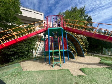 轟木公園の長い大きな滑り台が子どもたちのお気に入りの一つ。急な坂を駆け上がり、遊具に向かいます。