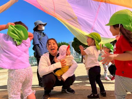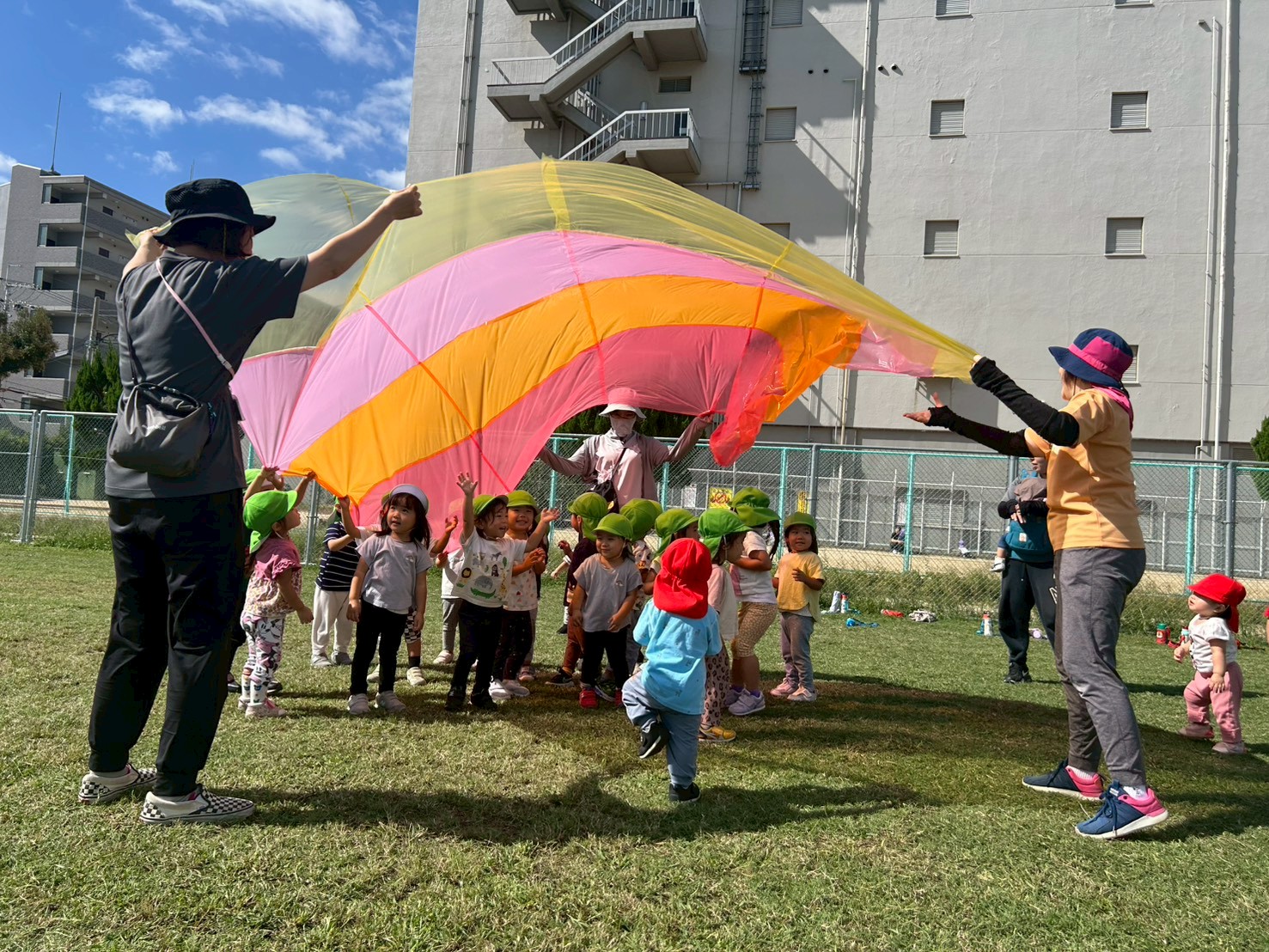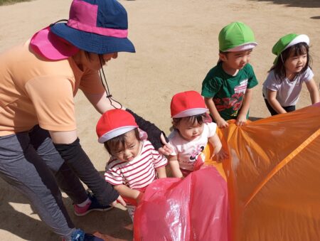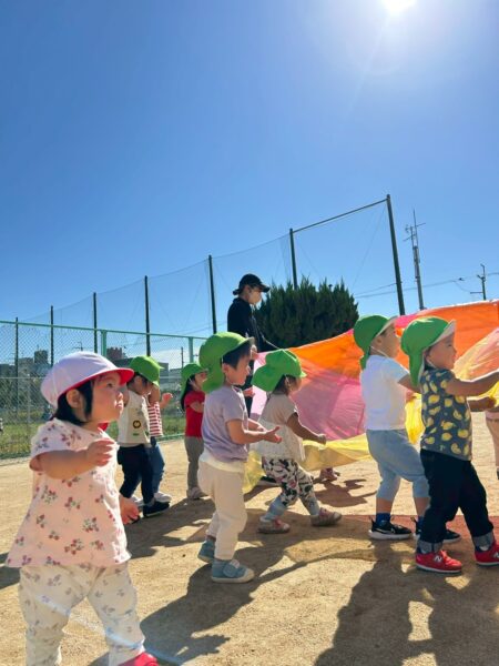 先日、かえで組(2歳児)のお兄さんお姉さんと一緒にパラバルーンをして遊びました。