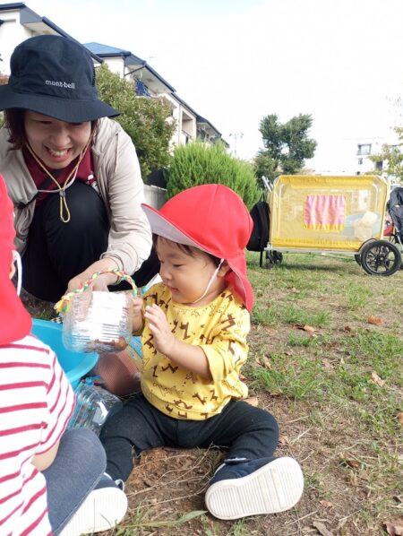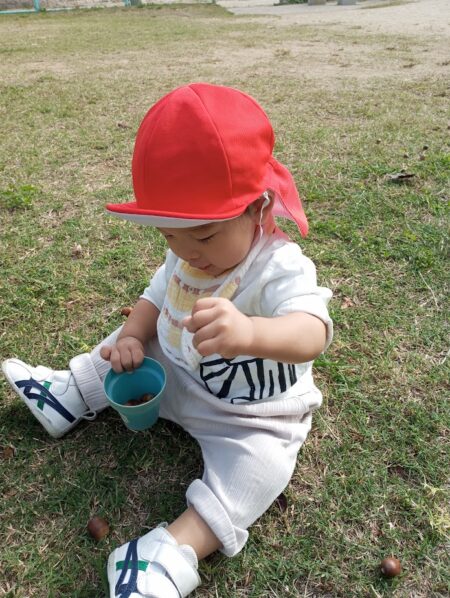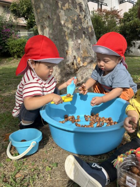 次にどんぐり遊びの様子です。たくさん触れて大満足の子どもたち。