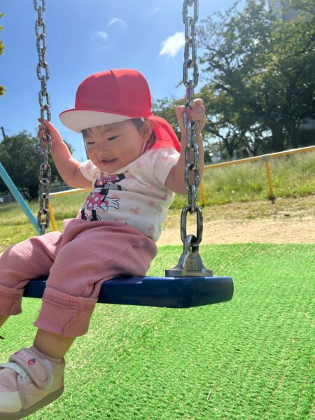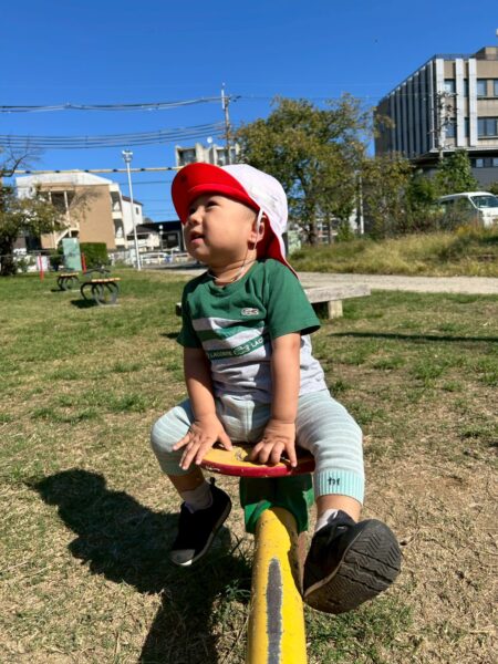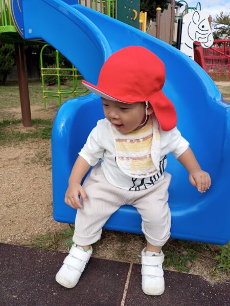 階段に登ったり、滑り台やブランコをしたり、坂道も上手にバランスを取りながら元気に登っていきます。