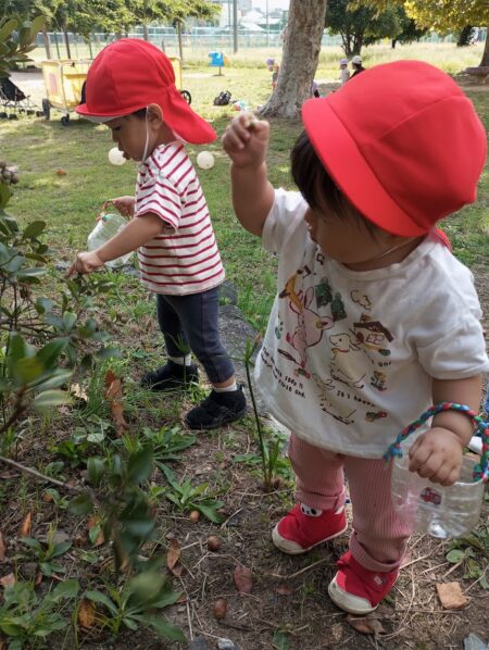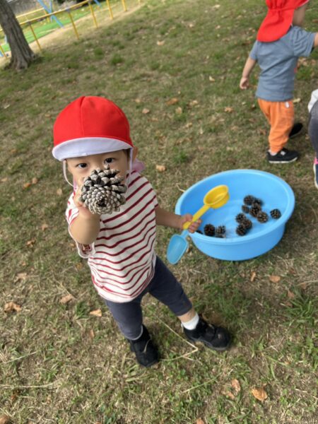 どんぐりだけでなく、まつぼっくりや木の実も発見!心と体で秋を感じ、それぞれに楽しんでいました。