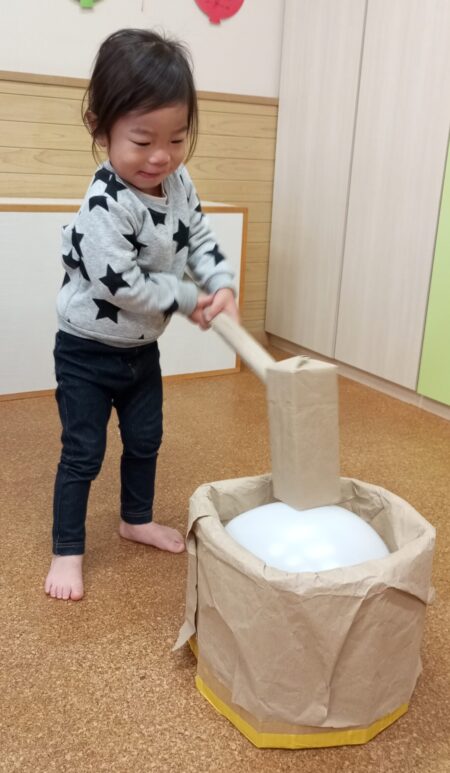 他にも、手作りの 臼と杵 を使って、風船のおもちを「ぺったんこ!」