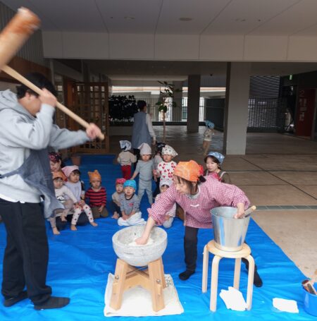 みんなで力を合わせて、おもちつきの雰囲気をたっぷり味わうことができました。