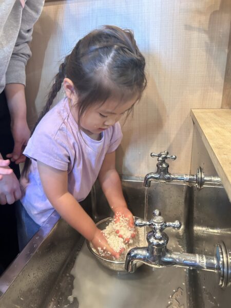 手にお米がつく感触や、流れていく水が白く濁る様子をじっくり観察しながら、興味津々で取り組んでいました。